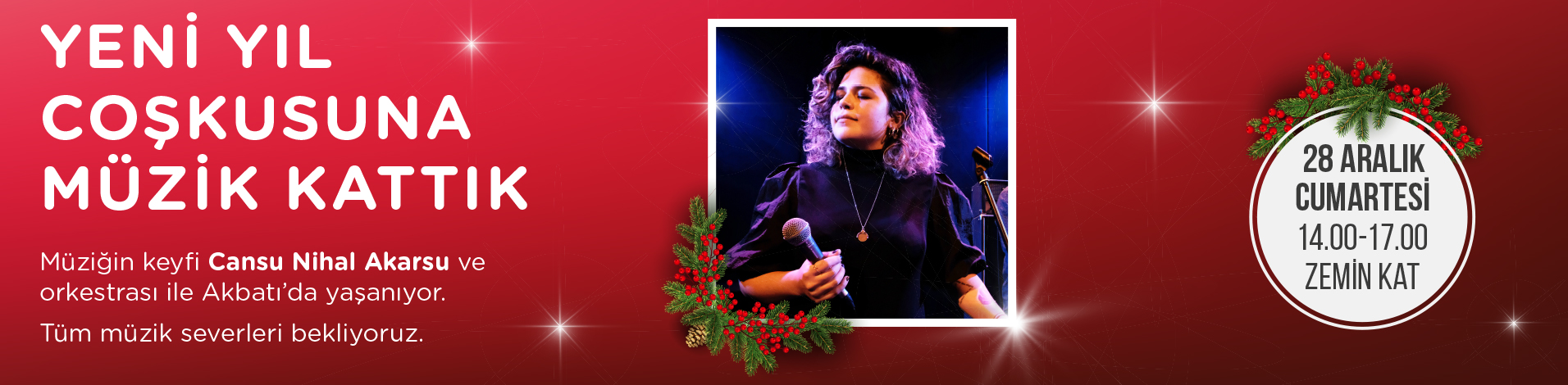 Yeni yıla sayılı günler kala sağlıklı 28 Aralık Cumartesi günü caz müziğin sevilen isimi Cansu Nihal Akarsu ve orkestrası 14.00-17.00 saatleri arasında benzersiz bir performans sergileyecek.