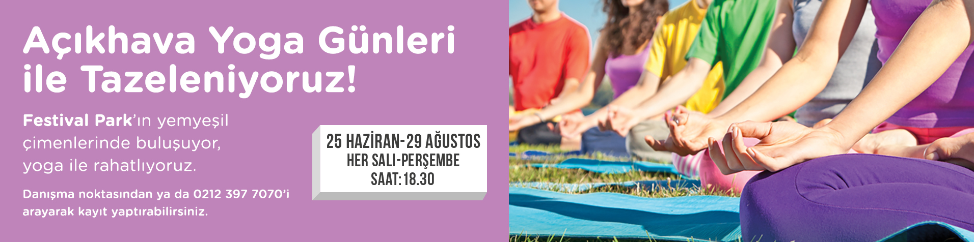 Yogayı ilk defa deneyimleyecek olan misafirlerin kendilerini huzurlu bir dünyada hissedeceği etkinlik ruhlarını arındıracak. Tüm yorgunlukları alacak olan açık havada yoga, 25 Haziran – 29 Ağustos tarihleri arasında her hafta salı ve perşembe günleri gerçekleşecek. Maya Yoga eğitmenleri eşliğinde her seviyeden katılımcı ile gerçekleşecek egzersizler 18:30-19:30 saatleri arasında Festival Park’ta düzenlenecek.