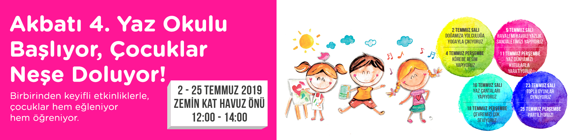 Bu yıl 2-25 Temmuz tarihleri arasında dördüncüsü düzenlenen Akbatı Yaz Okulu çocuklara birbirinden yaratıcı ve keyifli atölyeler ile etkinliklerle dolu bir yaz vadediyor. Birbirinden yaratıcı etkinliklerin yanı sıra yoga ve spor etkinlikleri ile çocuklara yepyeni deneyimler yaşayacak.