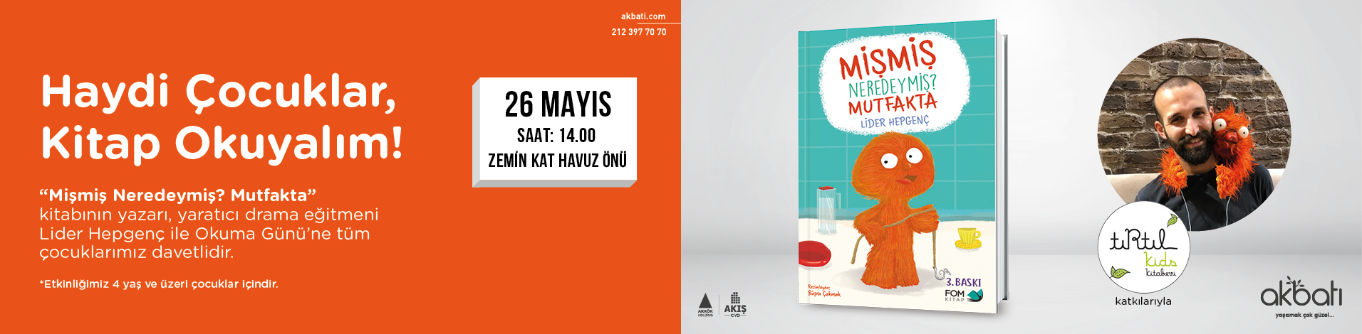 “Mişmiş neredeymiş? Mutfakta” kitabının yazarı, yaratıcı drama eğitmeni Lider Hepgenç ile Okuma Günü’ne tüm çocuklarımız davetlidir.