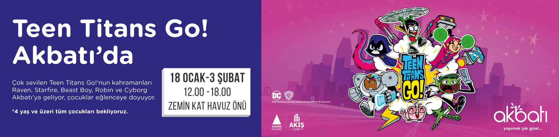 Cartoon Network’ün sevilen çizgi filmi Teen Titans Go! karakterleri, yarı yıl tatilini keyifle geçirmek isteyen minik misafirlerle Akbatı AVM’de buluşuyor. 18 Ocak- 3 Şubat tarihleri arasında gerçekleşecek etkinlikte çocuklar eğlenceye doyacak. Minik katılımcılar, Raven, Starfire, Beast Boy, Robin, Cyborg’dan oluşan süper kahraman ekibiyle birlikte enerjilerini atabilecekleri keyifli bir gün geçirecekler.