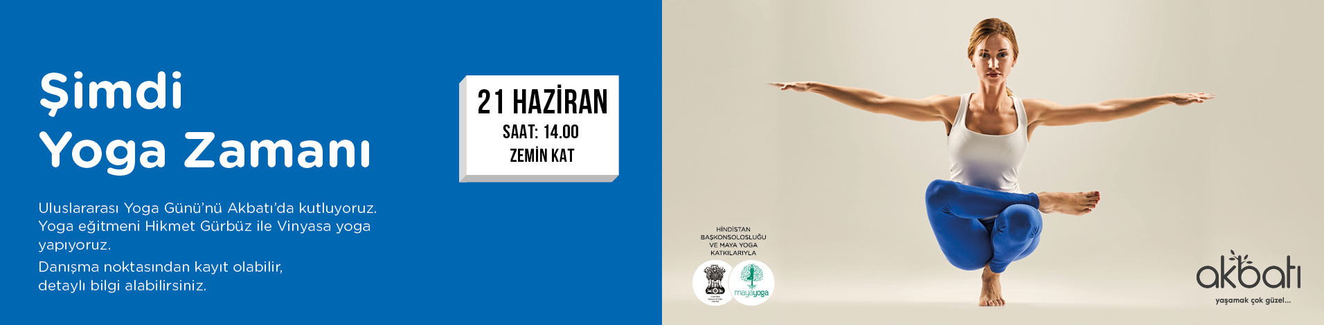 21 Haziran Uluslararası Dünya Yoga Günü Akbatı’da kutlanıyor. Binlerce yıldır süregelen yoga kültürünün anlatılacağı etkinlikte Maya Yoga kurucusu Hikmet Gürbüz’ün eğitmenliğinde gerçekleştirilecek Vinyasa Yoga ile misafirler fiziksel esnemenin yanı sıra duygusal ve zihinsel olarak da rahatlama deneyimini yaşayacaklar.