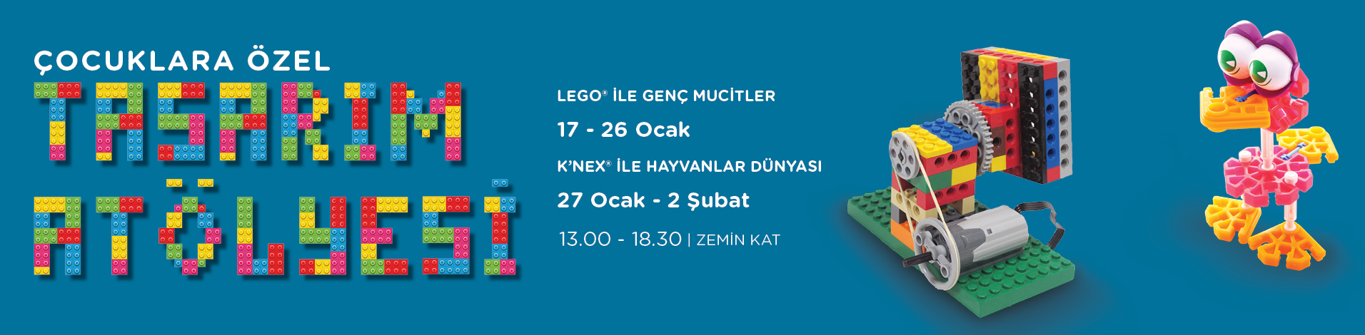 Yarı yıl tatilini keyifle geçirmek isteyen çocuklar, Akbatı’da gerçekleşecek iki ayrı tasarım atölyesi ile yaratıcılıklarını geliştirecekler. 4 ila 12 yaş arasındaki tüm çocuklar için tasarım atölyelerin kurulacağı Akbatı’da; ilk olarak 17 Ocak – 2 Şubat tarihleri arasında LEGO® ile Genç Mucitler Atölyeleri kullandıkları makinaları inşa edecek. Atölyede dört ayrı yaş grubu için farklı becerileri geliştirecek etkinlikler olacak. 4-5 yaş grubu için; rengarenk yürüyen bant, topaç, dönen salıncaklar, 6-7 yaş grubu için; pulluk, çamaşır makinesi, asfalt düzleme aracı ve 8-9 yaş grubu taşıma bandı, metronom, araç çekici, son olarak 10-12 grubu için ise; vinç, yeldeğirmeni, elektrik santrali modelleri yapacak. Atölyeler 13.00 ila 18.30 saatleri arasında zemin kat havuz önünde gerçekleşecek ve tüm çocukların katılımına açık olacak.